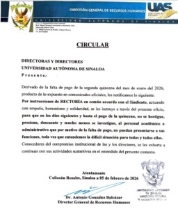 La parálisis financiera en la Universidad Autónoma de Sinaloa ha escalado a un nivel sin precedentes. Este jueves, la Dirección General de Recursos Humanos emitió una circular oficial en la que admite la incapacidad de la institución para cubrir los salarios correspondientes a la segunda quincena de enero de 2026. Ante esta situación, la administración central ha instruido a los directores de todas las unidades a permitir que el personal que no tenga recursos para trasladarse se ausente de sus labores sin represalias.